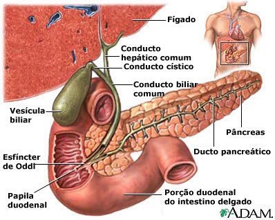 A vesícula é um reservátorio de Bilis situado no piso inferior do fígado constituída por um fundus, um corpo e um colo. Continua-se por um conduto cístico, que vai encontrar o ducto hepático e se vai dirigir para baixo e para a esquerda, passando por detras do piloro e 1º duodeno, atravessando praticamente a cabeça do pâncreas, onde se liga ( na maioria das vezes) ao ducto pancreático para depois penetrar no bordo interno do 2º duodeno, num local valvular designada por esfinter de oddi que funciona como uma válvula que abre e fecha permitindo a passagem destes sucos para o duodeno.